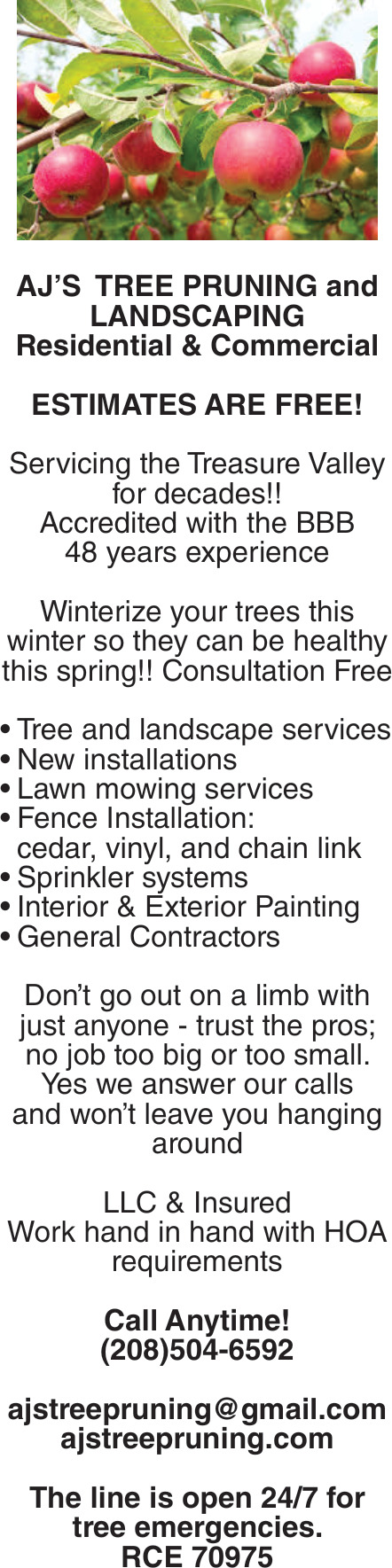 Mar 01, 2026. Aj's Tree Pruning Tree Service Services from Idaho Press Services
